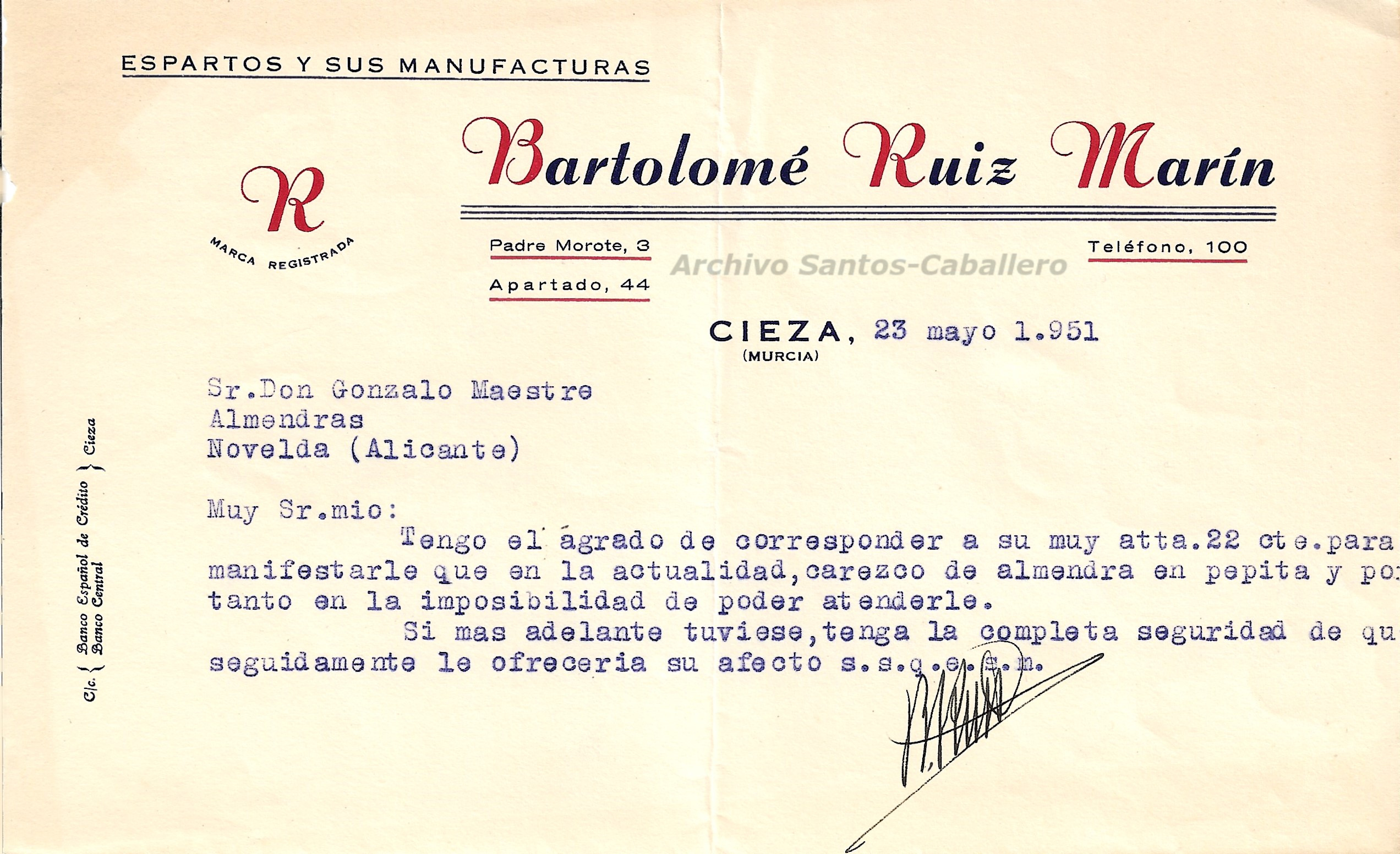 En 1951 Bartolomé también cotizaba en Cieza como corredor de productos de la tierra que trabajaba en las mismas instalaciones: coloreaba naranjas y manufacturaba almendra que exportaba a través de empresarios de Alicante. De hecho, en nuestro archivo conservamos una carta de Bartolomé Ruiz Marín, fechada el 23 de mayo de 1951, donde el empresario contesta al industrial de Novelda, Gonzalo Maestre, que no podía servirle en ese momento almendra en pepita.