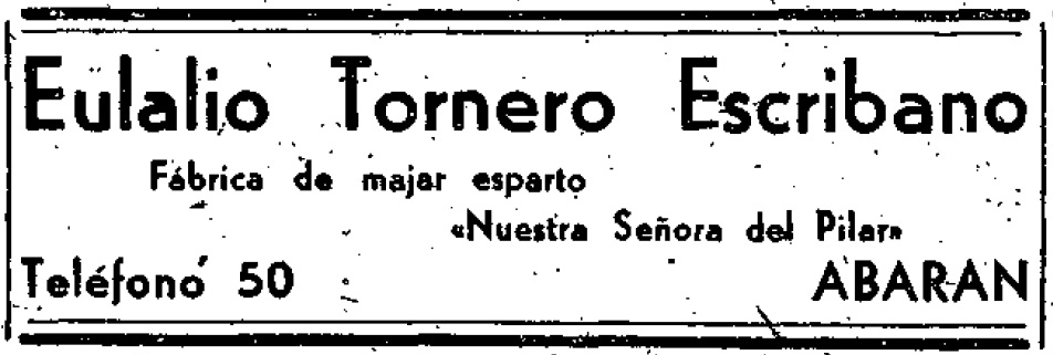 En el periódico Línea del 23 de septiembre de 1941 los hermanos Tornero anunciaban sus fábricas de esparto. José María “Esparto majado para lías de todas clases de hilados (Puente)” y Eulalio sólo se anunciaba como fábrica de majar esparto, pero al año siguiente ya explicaba que producía “esparto majado para yuteras, usos agrícolas y toda clase de hilados”, añadiendo el nombre de su empresa: Nuestra Señora del Pilar. Para la Feria y Fiestas de 1945 José María añadía al anuncio de su fábrica de majar esparto, los hilados y trenzados de esta fibra y la dirección D. Gómez, 19. El 18 de noviembre de 1946 Eulalio registraba, en la Oficina Española de Patentes y Marcas de Madrid, su marca de fábrica. Una “E” mayúscula en color rojo para distinguir sus manufacturas y picado de esparto.