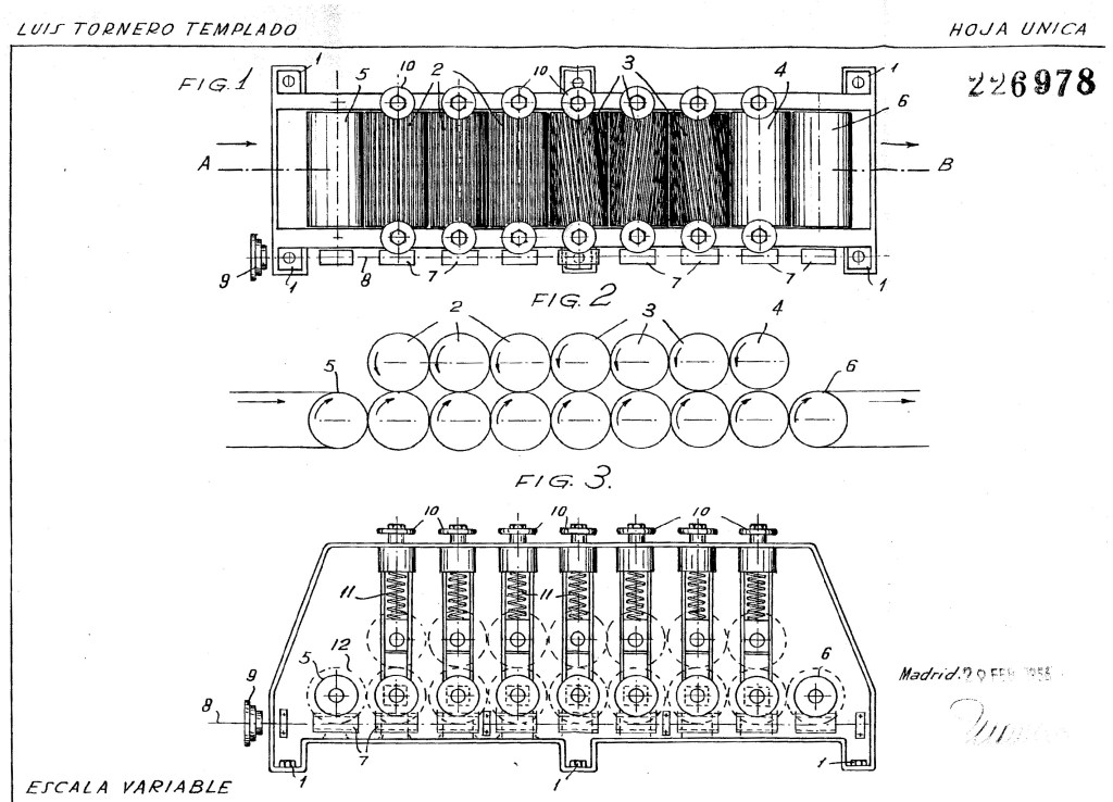 En 1961 Ángel Tornero patentaría una máquina de majar esparto mediante rodillos, similar a la de su primo Luis. La patente se titulaba: “Nueva máquina para el tratamiento de plantas textiles que se destinan a usos industriales”. Tenía husillos de apriete para los muelles tensores y cojinetes con guías que permitían bascular a los rodillos cuando pasaba el esparto entre ellos. El objeto de esta máquina, como otras similares, era eliminar la parte leñosa de la planta sin dañar su fibra útil, como bien explicaba su inventor en la memoria de la patente. No sabemos qué rendimiento tuvo esta máquina pero seguro que haría su papel en el trabajo del industrial.