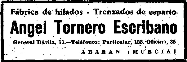 La década de los sesenta sería ya el final de muchos negocios de esparto, aunque sabemos que en el 73 Ángel todavía seguía trabajando por el periódico Línea del 26 de mayo de 1973, que anunciaba el incendio en la fábrica de espartos de Cieza, propiedad de Ángel Tornero, situada en el paraje de Bolvax. Según nos cuenta su sobrino Domingo allí tenía una balsa de macerar esparto y algunos almacenes. No dice nada la noticia sobre los daños materiales que tuvieron lugar. Hombres inteligentes y esforzados empresarios los hermanos Tornero Escribano contribuyeron con sus industrias, junto a otros muchos, al desarrollo comercial e industrial de Abarán.